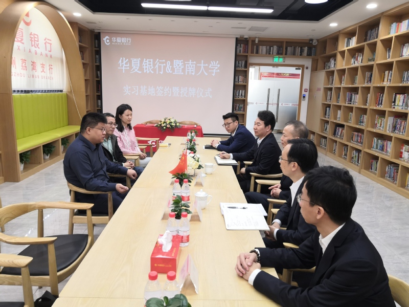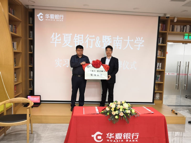 2月4日上午,暨南大学管理学院会计学系和华夏银行广州分行实习基地签约暨授牌仪式在华夏银行广州分行荔湾支行举行,暨南大学管理学院会计学系谭有超副主任、石水平教授、宋莉莉、王东,华夏银行广州分行副行长洪流、华夏银行广州分行人力资源部总经理彭亚凯、华夏银行广州分行荔湾支行行长黄顺、华夏银行广州分行荔湾支行副行长徐刚和华夏银行广州分行光大社区支行行长丘广明出席签约暨授牌仪式。