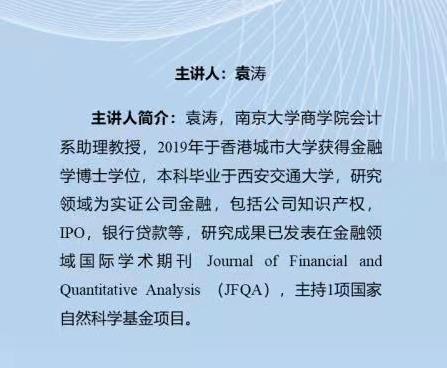 2021年5月14日上午,“暨南大学管理学院会计学系学术论坛”第219期在惠全楼314室举行。本次论坛由会计学系杨斌老师主持,南京大学商学院会计学系袁涛助理教授应邀为我系师生分享了题为《do banks overreact to disaster risk?》的工作论文。