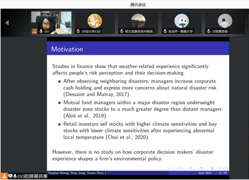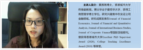 2021年6月4日星期五上午10时,“暨南大学管理学院会计学系学术论坛”第221期采用线上形式在腾讯会议上成功举行。此次论坛由杨斌老师主持,主讲人为香港城市大学终身副教授黄茜茜,黄教授分享了她的工作论文,题为《directors’ personal experience and corporate environment performance》。