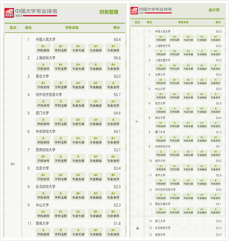 2021年6月22日,高等教育评价专业机构软科正式发布2021“软科中国大学专业排名”。排名包括509个本科专业,每个专业榜单发布的是所有开设该专业的高校中排名位列前50%的高校,共有925所高校的28550个专业上榜。“软科中国大学专业排名”是迄今为止覆盖专业数量最多、参评专业规模最大的中国大学本科专业排名。排名结果显示,暨南大学财务管理专业位列全国第十一,在a 层次;会计学专业位列全国第十五,在a层次。