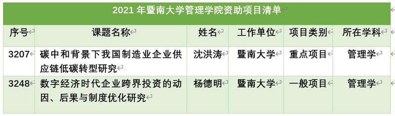 9月3日,2021年国家社科基金项目公布立项公示。我系沈洪涛教授、杨德明教授分别荣获重点项目——“碳中和背景下我国制造业企业供应链低碳转型研究”,与一般项目——“数字经济时代企业跨界投资的动因、后果与制度优化研究”的资助资格。
