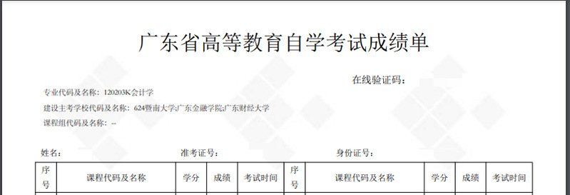 成绩单需要显示:专业代码及名称、建设主考学校代码及名称、姓名、准考证号、身份证号