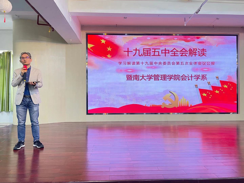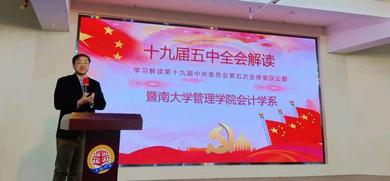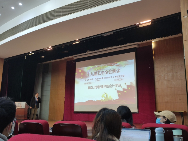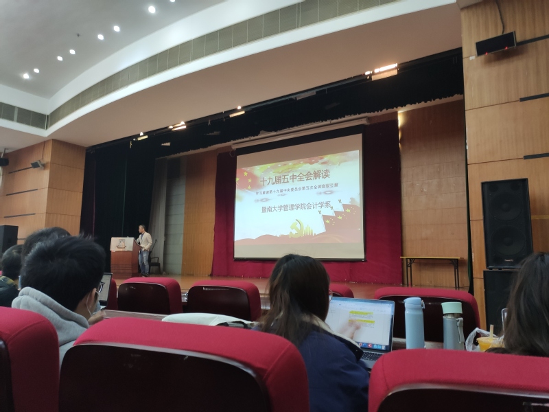 2020年12月7日上午,管理学院会计学系在管理学院101室和瘦狗岭校区第一教学楼六楼会议室召开十九届五中全会学习报告会暨学科评估宣讲会,管理学院会计学系主任饶品贵和管理学院会计学系教工党支部书记黄微平主讲,管理学院会计学系全体研究生参加。